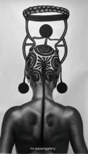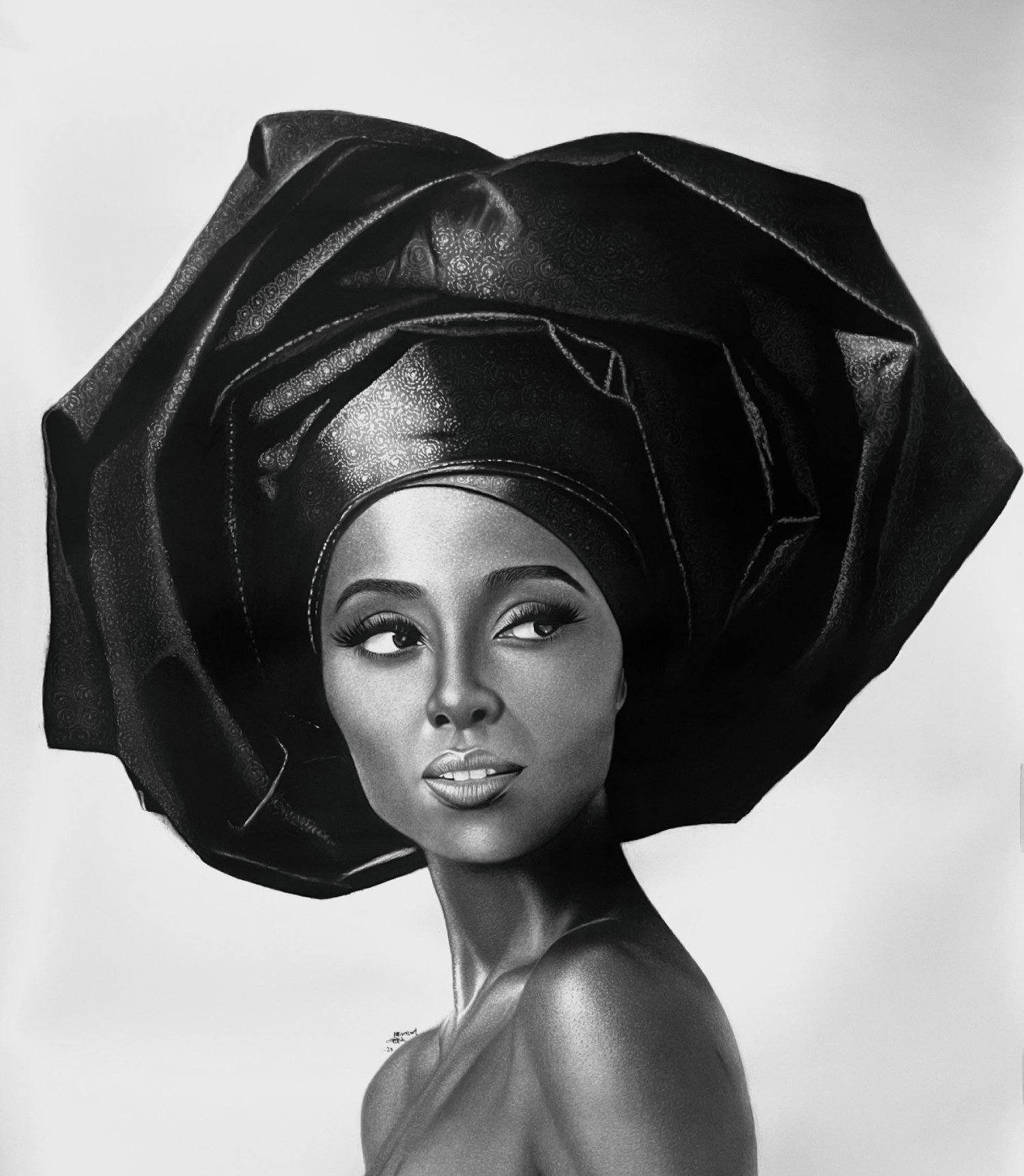 A profoundly striking piece from the “African Princess” series, this hyper-realistic portrait is a masterful fusion of heritage, adornment, and high-concept style. The artwork features a stunning, sculpted updo beautifully embellished with cowrie shells—symbols of wealth, destiny, and reverence across many African cultures. The shells form a captivating veil over the subject’s eyes, focusing attention on her bold lips and intense gaze. This monochromatic drawing is a powerful statement about divine beauty, cultural regality, and the sacred artistry of self-expression.