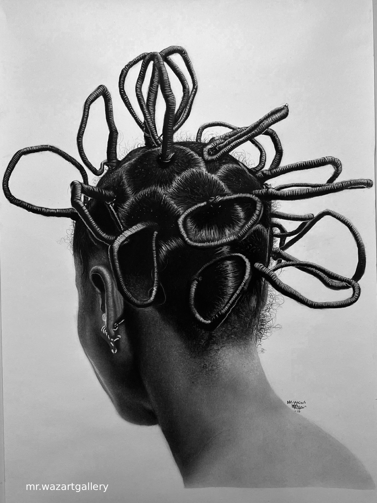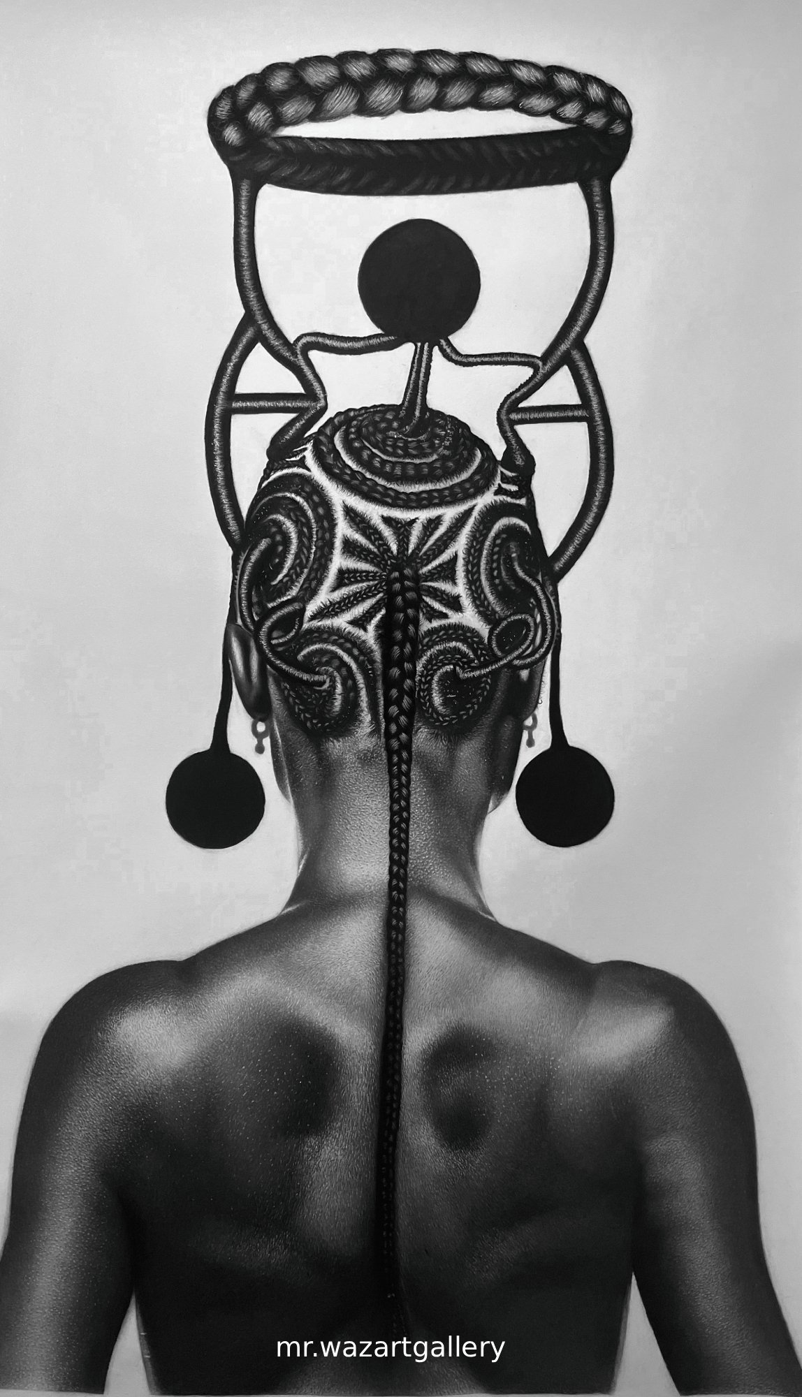 A mesmerizing piece from the “African Princess” series, this hyper-realistic portrait captures a profile of regal defiance and artistic freedom. The hair is transformed into a sculptural crown of upward-reaching, spiked lines, creating a visual explosion of energy. With her face lifted and eyes partially closed, the subject embodies a moment of powerful inner strength and graceful ascension. This monochrome work is a bold statement on innovation and the vast, unlimited potential of African hair as art.