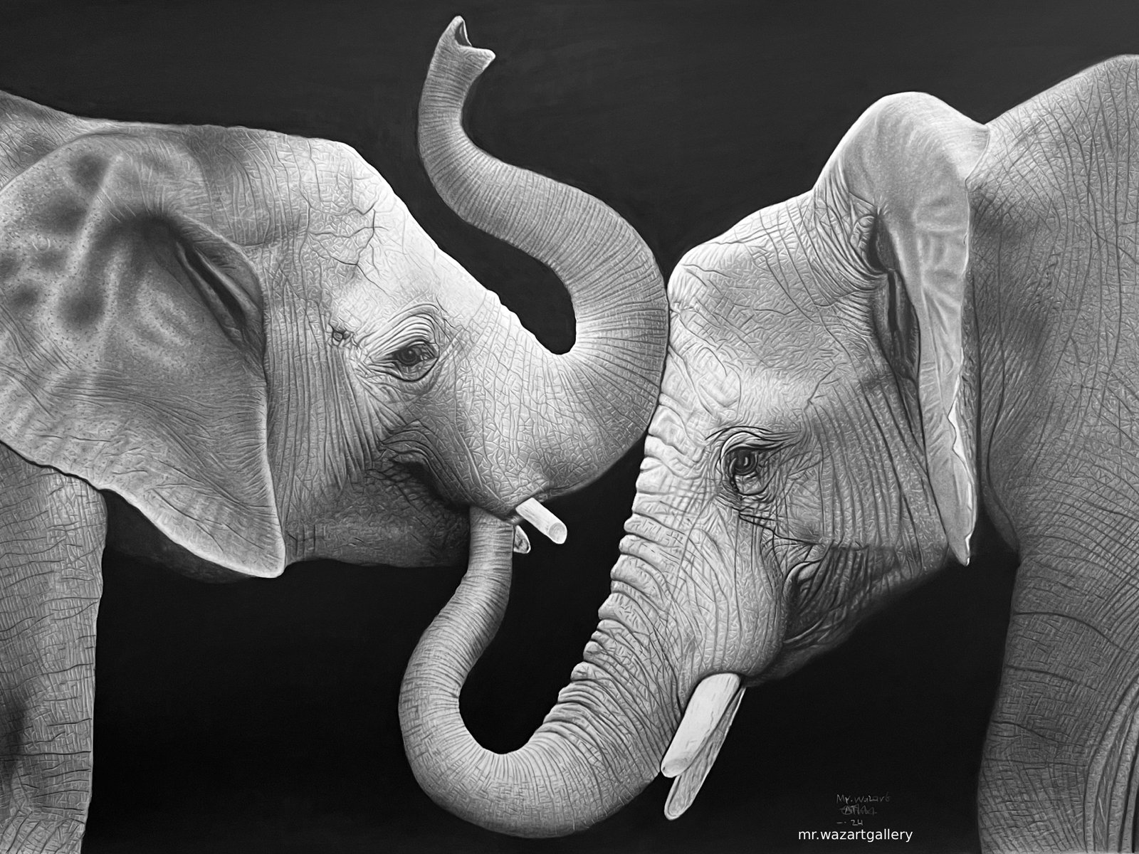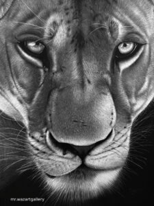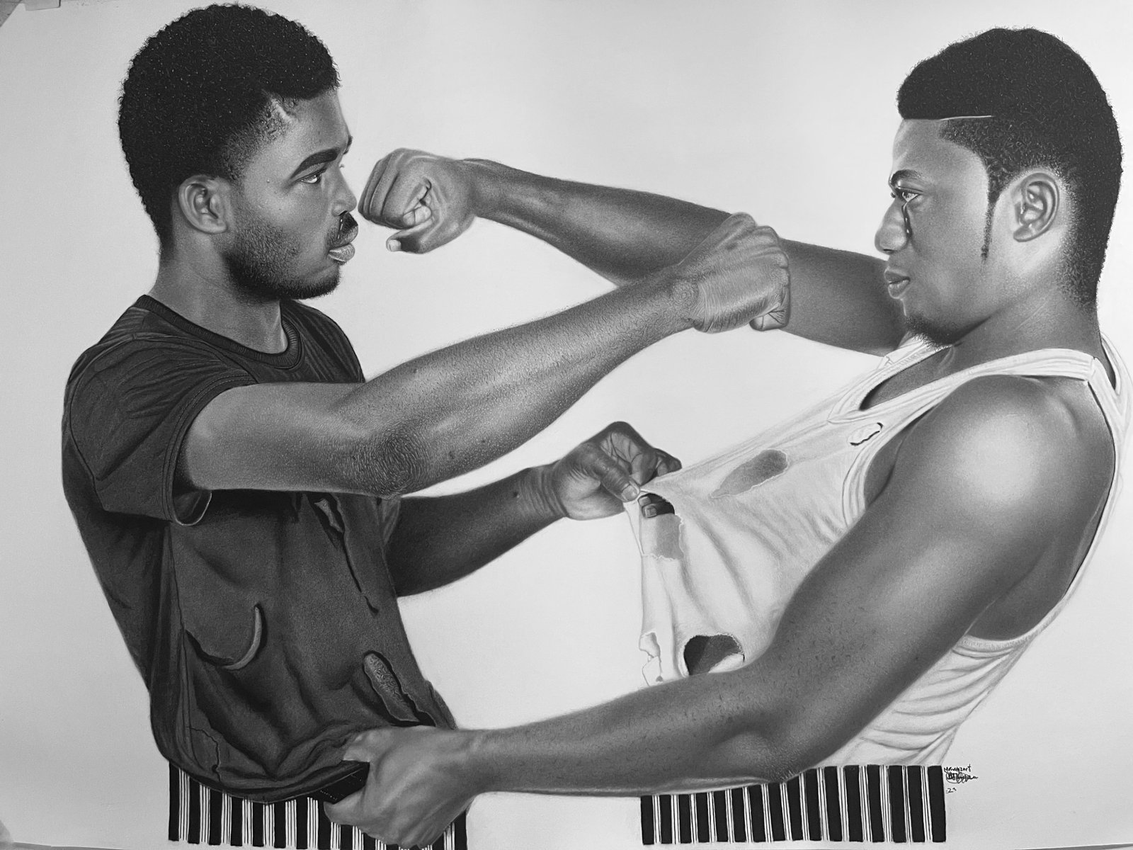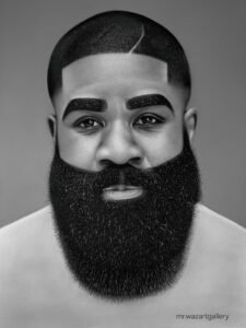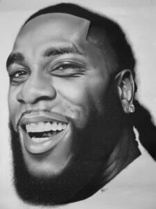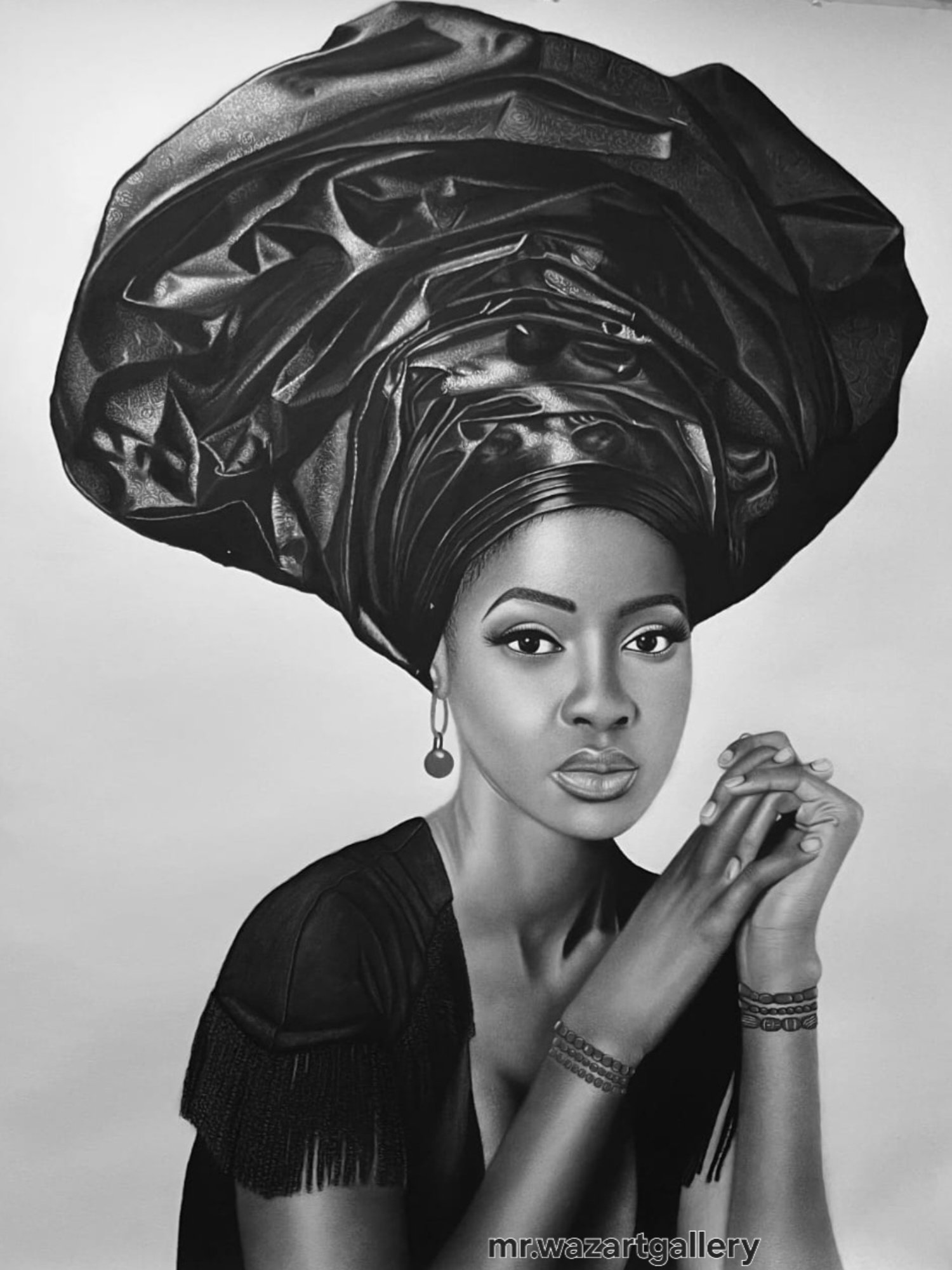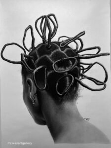 This commanding hyper-realistic portrait captures the essence of Ghanaian Afropop, dancehall, and reggae artist, Stonebwoy. The detailed monochrome rendering masterfully showcases his signature style, from the intricate texture of his locs to the powerful intensity in his gaze. With his hands positioned across his chest, the work projects the artist’s confidence, depth, and creative spirit. It is a dynamic tribute to one of Ghana’s most influential global music figures, executed with breathtaking precision.