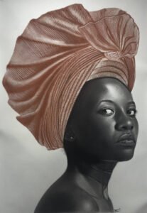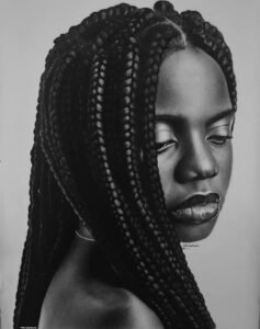 This breathtaking hyper-realistic portrait is an intimate and profound tribute to African elegance and protective styling. Titled “African Princess,” the artwork beautifully captures a moment of quiet introspection and deep grace. The drawing is a masterclass in texture, with the hundreds of individual box braids rendered in meticulous, photorealistic detail, emphasizing the cultural artistry woven into every strand. The subtle contrast of light and shadow highlights the subject’s luminous skin and contemplative expression, celebrating the inherent beauty, strength, and royalty of Black womanhood.